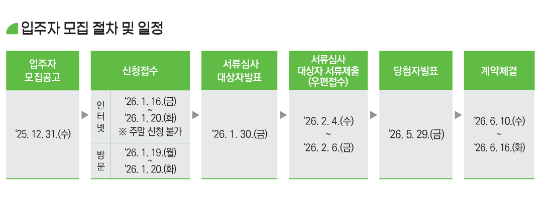 | 인터넷 청약 | 2026. 1. 16.(금) 10:00 ~ 1. 20.(화) 17:00 (주말 불가) | 마감 직전 접속 폭주 대비해 1~2일 전 완료가 안전해요. |