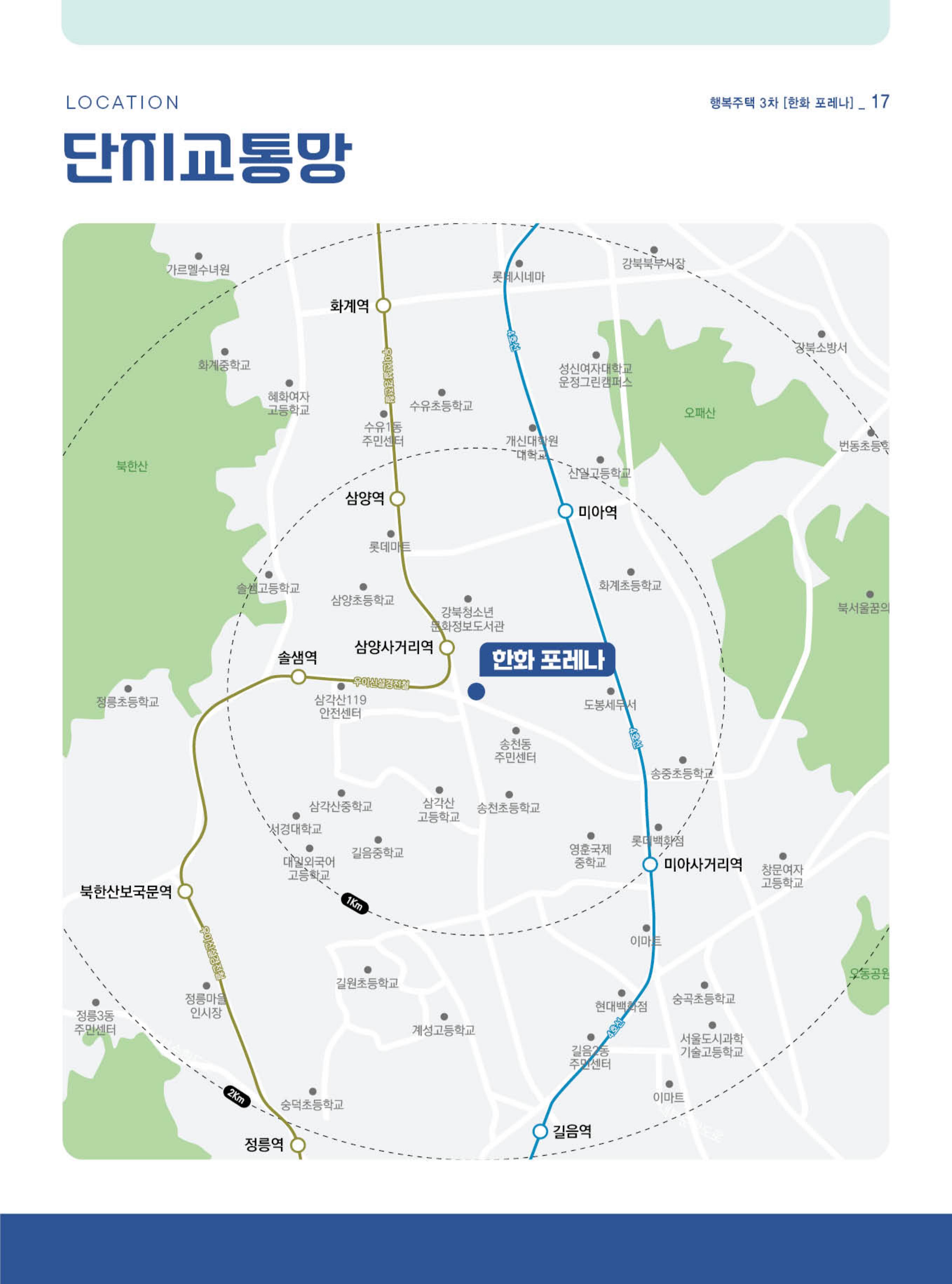 단지교통망에는 4호선(미아역·미아사거리역·화계역 등)과 우이신설경전철(삼양역·삼양사거리역·솔샘역 등)이 함께 표기돼요. 즉 “한 역 초역세권”보다는, 생활 반경 내에서 여러 역·노선을 조합하는 접근이 현실적이에요.