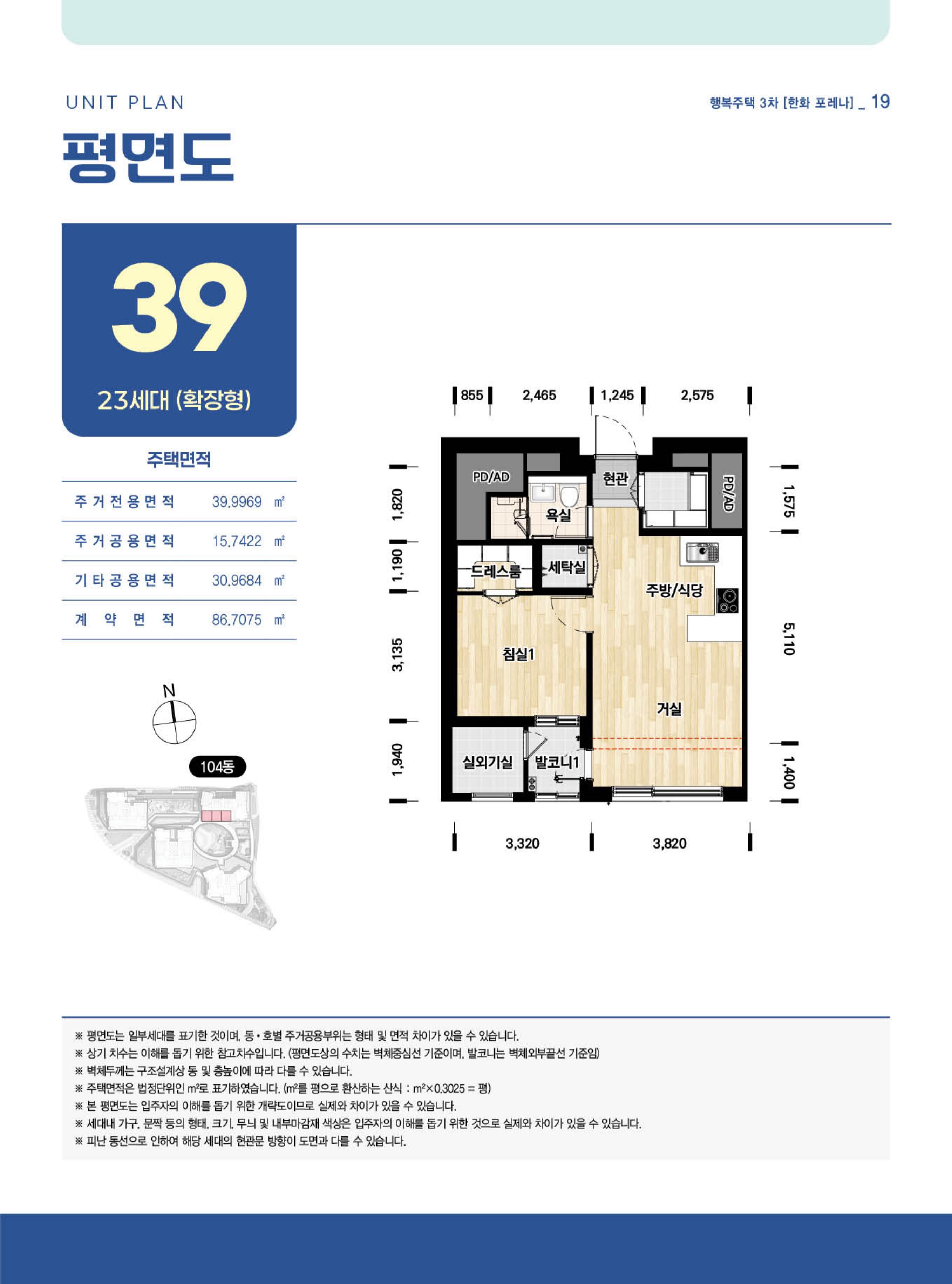 - 평면 핵심: 전용 39.9969㎡ / 계약 86.7075㎡로, “계약면적 착시”를 반드시 경계해야 해요.