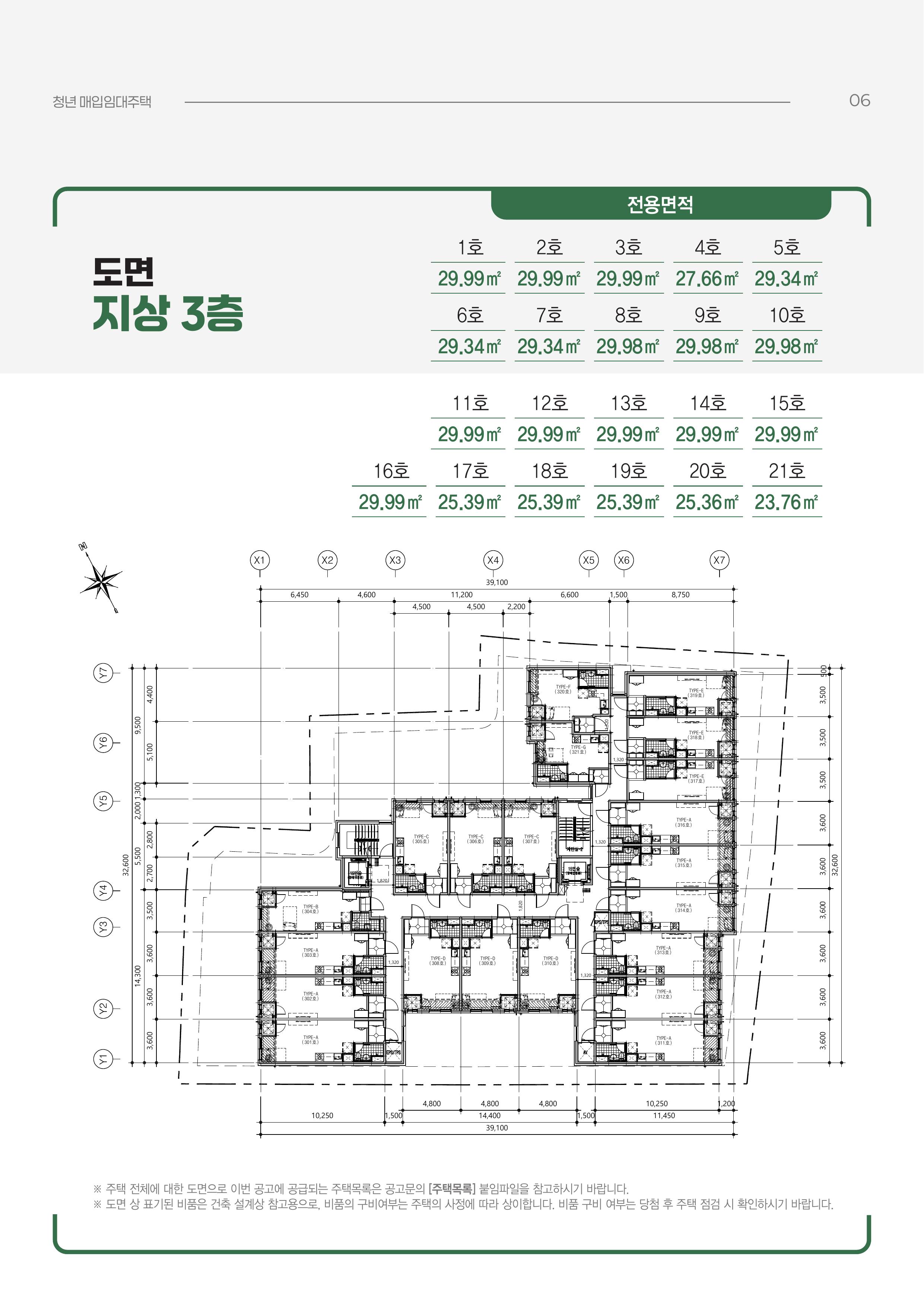 도면상 2~3층은 29.99㎡가 다수지만, 23.76㎡·25.36㎡·25.39㎡ 등 더 작은 타입도 있어요. 6층 도면에는 25㎡대(25.00/25.98 등), 24.46㎡, 26㎡대, 27㎡대, 29.99㎡까지 섞여 보여 “같은 건물이라도 체감이 달라지는” 구조입니다.