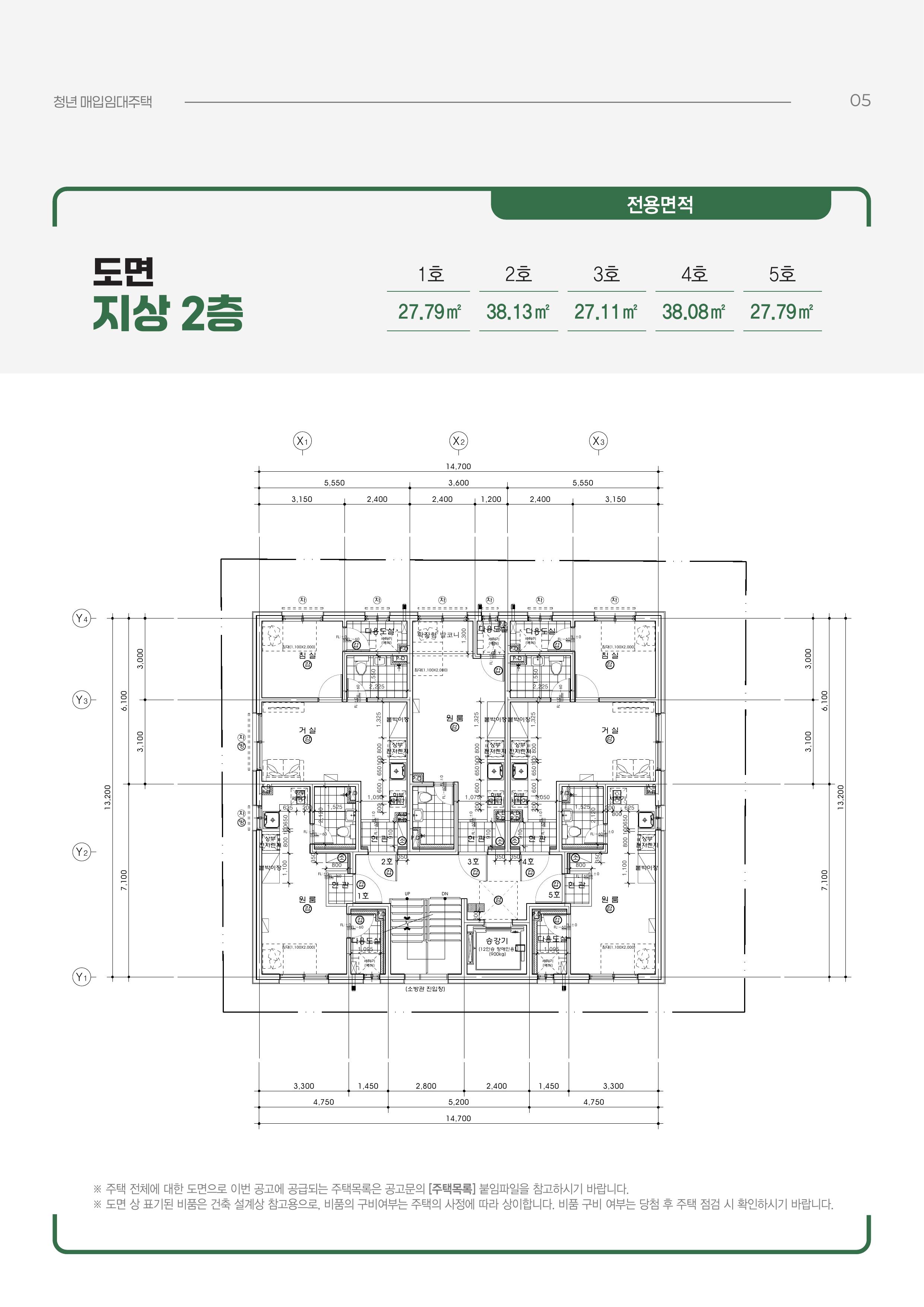 2~3층 도면에는 27㎡대(27.11/27.79)와 38㎡대(38.08/38.13)가 동시에 제시돼요. 4층에는 27.79㎡, 34.25㎡, 50.38㎡가, 5층에는 27.79㎡, 28.14㎡, 36.93㎡ 같은 면적이 제시되어 “같은 단지인데 집이 아예 다른 급”으로 나뉘는 구조입니다.